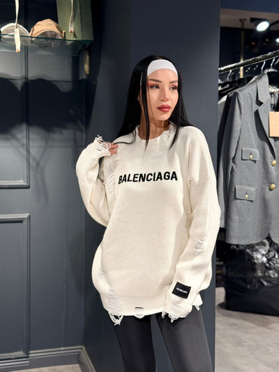 BEYAZ OVERSIZE YIRTIK DETAYLI KAZAK